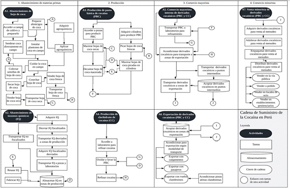 Es posible descomponer y describir la cadena de producción y comercio de la cocaína en el Perú en cuatro eslabones secuenciales y estos se descomponen en actividades (A) (que son las etapas operativas; Zevallos, 2022, p. 40): (1) abastecimiento de materias primas (A1 Abastecimiento de hoja de coca y A2 Abastecimiento de insumos químicos); (2) producción o transformación de estas materias primas en bienes de consumo (A3 Producción de pasta básica de cocaína y A4 Producción de clorhidrato de cocaína); (3) comercio mayorista (A5 Comercio mayorista interno de derivados cocaínicos y A6 Exportación de derivados cocaínicos); (4) comercio minorista (A7 Venta minorista de derivados cocaínicos). Los eslabones y actividades se descomponen en un conjunto de tareas específicas (véase Figura 1).