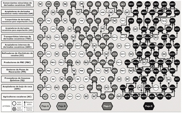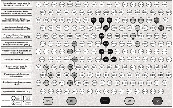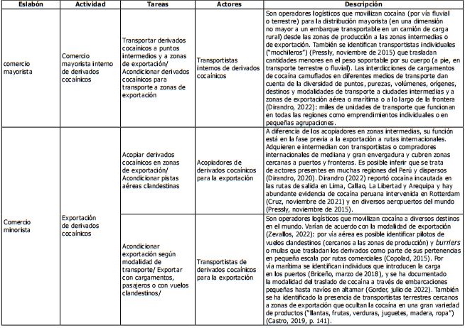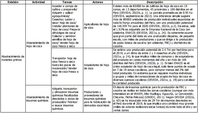 Por medio de la revisión de literatura especializada, documentos institucionales de agencias del control de drogas y entrevistas, se ha construido un inventario de actores (individuos, grupos u organizaciones), según eslabones funcionales que implican actividades y tareas, o conjuntos de tareas en la cadena de suministro de la cocaína. Por ende, cada actor es una síntesis conceptual para referirse a agentes que realizan tareas (o grupos de tareas); de ahí que en la práctica haya sujetos que pueden realizar varias tareas en más de una actividad de la cadena de suministro.