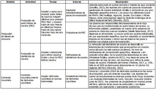 El ejercicio requiere tres consideraciones: (i) se han listado los actores directamente relacionados con la cadena de suministro, es decir, aquellos que cumplen una o más de las tareas de producción o comercio; (ii) se excluyen del listado los actores que participan indirectamente en la cadena que facilita estos procesos, sin cumplir directamente alguna de las tareas (p. ej., servidores o funcionarios públicos que omiten el cumplimiento de sus funciones en beneficio de aquellas tareas y actividades), y (iii) en el listado resultante es posible diferenciar a los actores a partir de dos criterios: (a) si esta tarea o actividad es necesaria o no para el desarrollo de la cadena, y (b) si esta tarea o actividad se realiza o no de manera exclusiva para la cadena. Algunos de estos actores son exclusivos de la cadena (los productores de derivados cocaínicos, p. ej., ya que solo pueden producir estos bienes para esta cadena de suministro), pero también hay actores necesarios, pero no exclusivos (los agricultores cocaleros, p. ej., ya que pueden proveer de hoja de coca al consumo tradicional o industrial, que no pertenece a esta cadena de suministro).