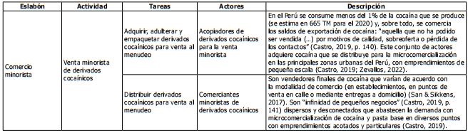 Este artículo tiene como objetivo principal describir el sistema de producción y comercio de cocaína en el Perú, lo que implica tres objetivos específicos: (i) describir las actividades y tareas de la cadena de suministro de cocaína, (ii) identificar y describir a los actores relacionados a esas actividades y tareas, y (iii) a partir de ambos elementos reconstruir el sistema de interacción. Para ello, se ha realizado un estudio exploratorio basado en la sistematización de fuentes secundarias y entrevistas a informantes expertos.