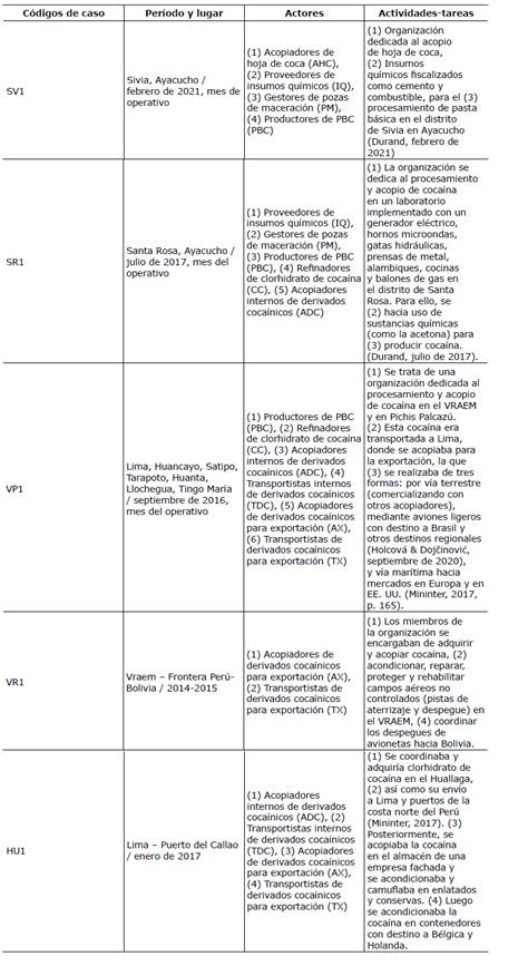 El análisis de casos permite entender el carácter segmentario del sistema. Se han seleccionado cinco casos: los dos primeros provienen de investigaciones antinarcóticos de policía sistematizadas por la prensa; el tercero y el quinto son resultado de las investigaciones de operativos mixtos (Policía y Fiscalía) en el marco de la estrategia “Mega operativos” (Mininter, 2017); el cuarto, es un caso de investigación fiscal con sentencia firme.