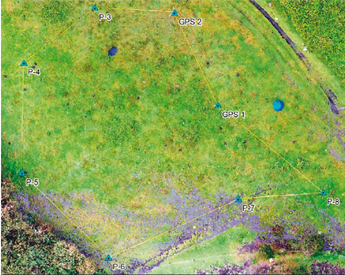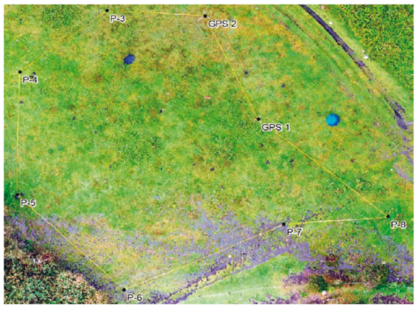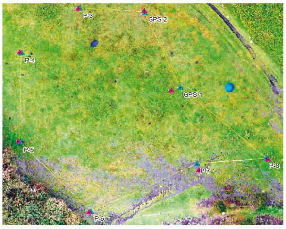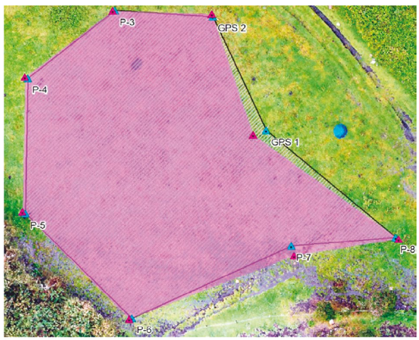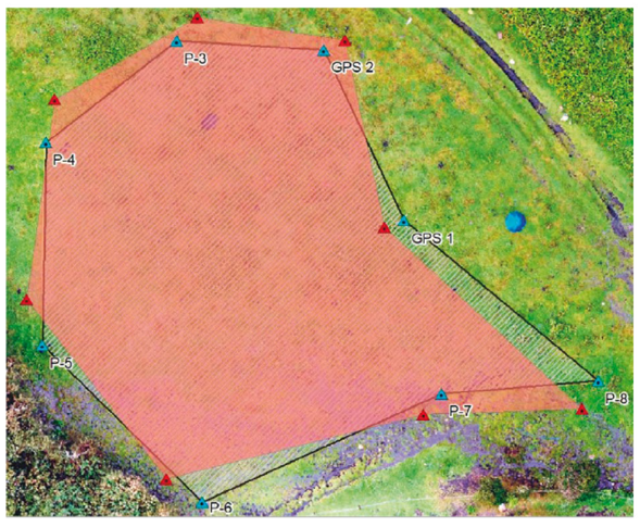 As already mentioned previously, with the wooden stakes an irregular polygon of eight vertices was created, which looks like a minefield (Figure 1), discovered by vegetation or structures on it, seeking the greatest precision in capturing the coordinates of each vertex.