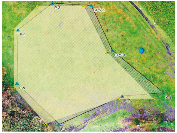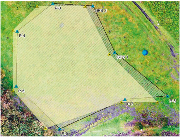 Unquestionably the most accurate method is the first method by means of static survey, with the two dual-frequency GNSS receivers, where the two GPS 1 and GPS 2 points were determined, if the length between two receivers is not very long, and a majority of errors such as clock error, orbit error, atmospheric error, etc. can be eliminated through difference (Dong-feng et al., 2009). As mentioned by Correa Muñoz and Cerón-Calderón (2018), the static method allows greater precision in geodetic and topographic surveys using two receivers: one located in a control station with coordinates previously determined with high precision, and the other as a receiver at a point whose coordinates are to be determined, in this case two receivers to be determined GPS 1 and GPS 2. For these points, a precision of 4 mm was obtained in the Latitude and Longitude coordinates, as seen on Table 2. As for the other vertices (P-3, P-4, P-5, P-6, P-7 and P-8) with the second capture method, relative survey stop & go, the Latitude and Longitude coordinates were determined, with accuracies that vary between 4 mm and 1,9 cm, see Table 3. In this sense, these two methods are the ones that most accurately represent the polygon of the minefield, as shown see in Figure 6. From these coordinates the comparison with the other methods will be made.