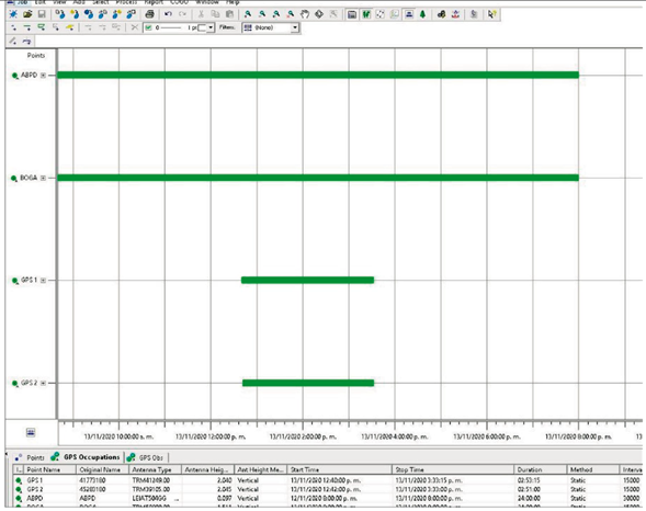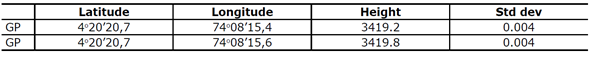 Correction of the geographic coordinates of the GPS 1 and GPS 2 vertices was performed using the corresponding RINEX files at the time of capture, generated by GNSS stations Continuous Operation BOGA and ABPD (SIRGAS, 2018) located in the city of Bogotá, state-owned stations belonging to the Geocentric Reference System for the Americas (SIRGAS). Due to scarcity in software related to GNSS topography and cartography data processing, a specialised software in post process coordinates should be used (Niu et al., 2015). For this case, Topcon Tools accept parameters such as RINEX files, precise cartesian coordinates, exact GNSS network ephemerides, instrumental antenna height (the absence of this measure may fail position (Meyer & Hiscox, 2005)). The use of this software determines whether there is overlapped tracking time between the continuous stations and the GNSS receptors (GPS 1 and GPS 2) that allow the generation of adjustment vectors to the relative position of two vertices. See Figure 3.