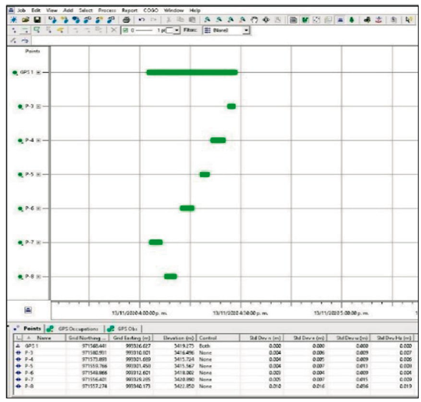 The second method of capturing the geographical coordinates was carried out by means of relative survey or better known as stop & go, this method is fast, efficient and allows the georeferencing of a succession of points with precision in centimeters (Wyloe & Featherstone, 1995). The GPS 1 base receiver remains static performing tracking, while the other Rover receiver is stationed on each of the vertices P-3, P-4, P-5, P-6, P-7 and P-8, for 5 minutes, as shown in the graph of overlapping time tracking and vector generation adjusted to each vertex in Figure 4.