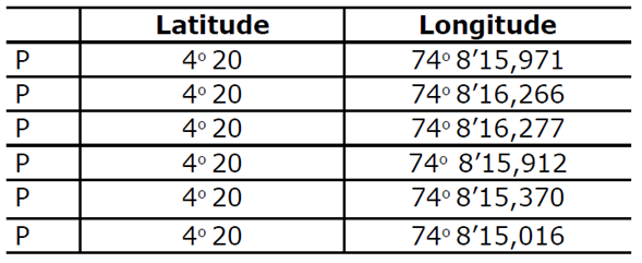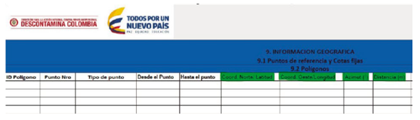 For the Colombian case, the National Mine Action Authority in the document “National Standard of Non-Technical Survey”, states in the section Mapping and Polygons Drafting, that all the georeferenced information of minefields must be stored in the geographic coordinates system, in decimal degrees and using the DATUM WSG84 (Descontamina Colombia, 2016). This means that all geographical information that allows the localisation and drafting of areas that determine the size of a minefield, as well as each of its vertices, must have the coordinates for latitude and longitude. More specifically in the report hazardous area and / or hazardous area confirmed document in which Descontamina Colombia collects detailed information on minefields, under section 9 (GEOGRAPHIC INFORMATION), there is a request to enter each vertex that makes up the polygon, in turn, its geographical coordinates (Latitude and Longitude) and the azimuth and the distance between vertices, see Figure 5 (Descontamina Colombia, 2018).