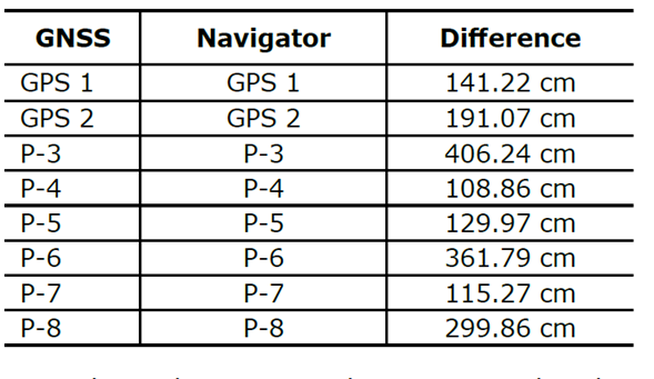 Having said this, when comparing the coordinates obtained using the fourth method, several studies have identified the mean error of handheld GPS units from 95 cm to 760 cm(Robinson et al., 2020). In this study using the GARMIN GPSMAP 64s navigator receiver, as shown on Table 10, the positional difference varies from 108.86 cm the smallest, to 406.24 cm the largest. Therefore, an average positional difference of 219.28 cm is obtained with this method.