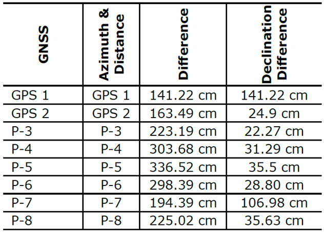 When comparing the coordinates obtained by the fifth method, using the compass and the tape measure, as shown on Table 11, the positional difference varies from 141.22 cm for the smallest to 336.52 cm for the largest. Having a positional difference of 235.73 cm on average. Figure 8 shows the positional differences between the vertices according to the GNSS (mark in blue) or Azimuth and Distance method (mark in red), data without magnetic declination corrections. The measured azimuth must be corrected for magnetic declination and deviation to obtain the true azimuth that is parallel to the geographic meridian (Iribar et al., 2014).