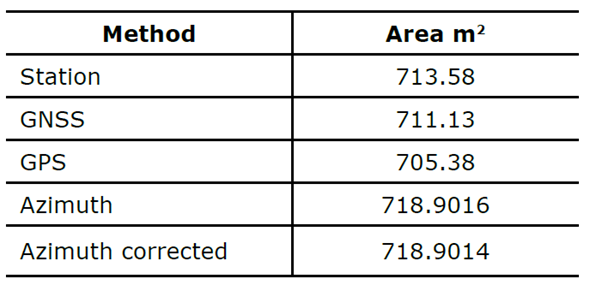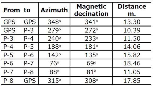 After the graphical representation in the office of the azimuths, distances and known coordinate point (GPS 1), the coordinates of the resulting vertices can be determined, a pair of coordinates without correction due to magnetic declination and another pair of corrected coordinates, such as are shown on Table 8.