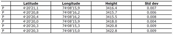 Using the second capture method, relative survey (stop & go). The GNSS receiver remained as a base at the GPS 1 vertex and the other receiver acted as Rover to acquire the coordinates of vertices P-3, P-4, P-5, P-6, P-7 and P-8, then of their respective post-processing. As can be seen on Table 3, a 95% confidence level was obtained and a standard deviation that varies between 0.004 m and 0.019 m depending on the point.
