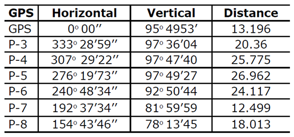 Using the third capture method, simple radiation surveying in which, as already mentioned, the horizontal and vertical angles and distances to the vertices are measured with the Total Station, from the GPS 1 vertex, as shown on Table 4. From the already known coordinates of GPS 1 and GPS 2, determined with the two GNSS dual-frequency receivers and the aforementioned data measured with the Total Station, it is possible to determine the geographical coordinates (Latitude and Longitude) of the vertices P-3, P-4, P-5, P6, P-7 and P-8, as shown on Table 5.