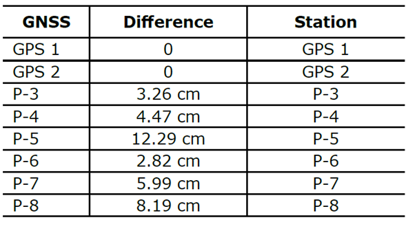 The coordinates obtained by the third method, topographic survey by simple radiation, are a control to the relative survey stop & go, since it was required to know the positional difference when tracking for a time of 5 minutes. As can be seen on Table 9, there is no positional difference between the coordinates of the GPS 1 and GPS 2 points, because the GNSS antennas and also the Total Station were located there. However, a difference is observed that varies between 2.82 cm, the smallest for P-6 and 12.29 cm, the largest for the P-5, thus guaranteeing that the stop & go method has an average of 4.62 cm of positional difference.