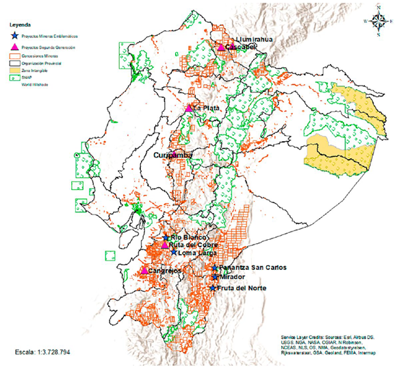 La Ley y Reglamento General de la Minería del 2009, establece el registro minero del sector, donde figuran los títulos de las concesiones y el catastro minero que lleva el registro gráfico y mapas catastrales. La Figura 1 muestra los polígonos donde se pretende efectuar la minería legal en Ecuador, así como los espacios donde no se puede hacer esta actividad, tales como el Sistema Nacional de Áreas Protegidas (SNAP) y las zonas intangibles. Ello se complementa con el referéndum y consulta popular realizado en el país el 4 de febrero de 2018, que prohíbe la minería metálica en todas sus etapas, como centros urbanos, zonas intangibles y áreas protegidas; así como con aquellas descritas en el artículo 81 de la Ley Orgánica de b (2010), el Convenio 169 de los Pueblos Indígenas (OIT, 1989) y con la Declaración de las Naciones Unidas sobre los Pueblos Indígenas (ONU, 2007).