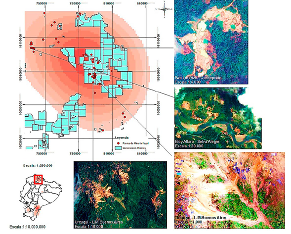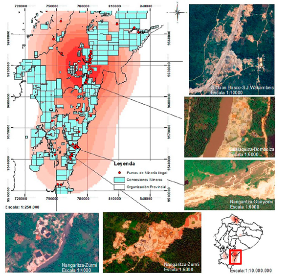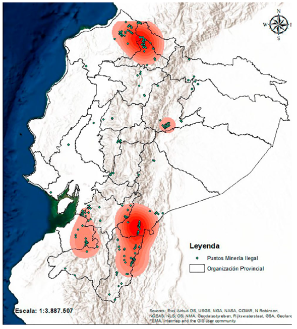 A continuación, se describen los siguientes enclaves productivos de la minería ilegal en Ecuador, propuestos mediante un mapa de calor realizado a partir de técnicas de teledetección y a la información recabada en fuentes primarias y secundarias: