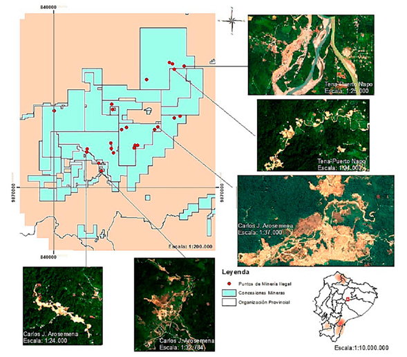 La Constitución de la República del Ecuador del 2008, estableció derechos a la naturaleza, posteriormente aplicados en la legislación para la protección ambiental, en el Código Orgánico Integral Penal del 2014 y la Ley de Minería del 2009. Si bien estas herramientas constituyen elementos de sanción administrativa y aplicación de la ley, en la práctica existe una serie de impedimentos para enfrentarlos, como la falta de control a las concesiones mineras, una ausencia general de coordinación entre instituciones e inconsistencias en las investigaciones ante la minería ilegal, relacionadas con una insuficiente planificación de recursos económicos y humanos. Estos obstáculos devienen, a su vez, de una complicidad y de esferas corporativas de corrupción de los diversos funcionarios públicos, en especial desde los gobiernos seccionales en donde se concentran las actividades mineras.