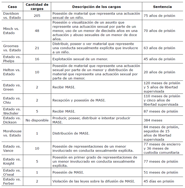 Entre los 37 documentos disponibles, cuatro de ellos se relacionaban con sentencias sobre casos de abuso infantil que no involucraron el uso del ciberespacio, 16 sentencias se relacionaron con jurisprudencia general con opiniones sobre casos relacionados con abuso infantil y pornografía sin identificar a los delincuentes o condenas individuales, y 17 documentos estuvieron relacionados con producción, posesión, distribución o fabricación de MASI. Estos documentos tenían información disponible sobre el caso, la persona sentenciada, los cargos y la sentencia presentada. Sin embargo, tres de estos documentos repetían información de otras sentencias analizadas con idénticos datos del mismo procesado y cargos penales, por lo que se seleccionó la muestra final de 14 casos (véase Tabla 1).