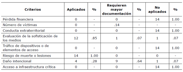 Los cuatro criterios restantes, “conducta extraterritorial”, “pérdida financiera”, “tráfico de dispositivos de acceso” (es decir, información de cuentas bancarias, números de seguro social, contraseñas y otra información personal) y “acceso a infraestructuras críticas”, no tuvieron una aplicación mayoritaria en los casos bajo análisis (véase Tabla 2).