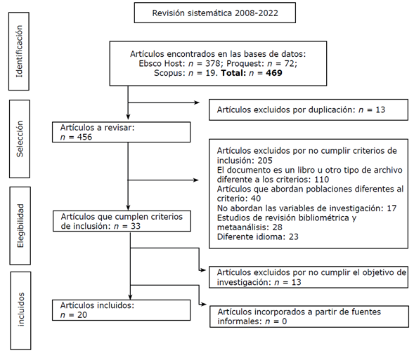 Los artículos identificados en formato RIS se exportaron con sus referencias a la página web Rayyan, la cual es una herramienta gratuita para la realización de revisiones sistemáticas. Se propusieron los criterios de inclusión y exclusión con énfasis en el tipo de estudio, la pregunta de investigación y el idioma. Tampoco se incluyeron los criterios de temporalidad. Asimismo, se eliminaron los registros duplicados (13 archivos) y se realizó un cribado de los artículos por título, palabras clave y resumen, para eliminar artículos que no cumplieran los criterios de elegibilidad. Los restantes 456 artículos prosiguieron a la primera fase de cribado (análisis de título, resumen y palabras clave), considerando los criterios de inclusión/ exclusión. Se excluyeron 449 estudios (353 a partir del título, 96 a partir del resumen) en esta primera fase. Los 20 artículos restantes que cumplieron con los criterios de elegibilidad forman parte de la investigación (Figura 1). Se procedió a la lectura de texto completo de los artículos incluidos tras el primer cribado para la revisión y discusión conjunta entre los revisores; analizando los artículos con base en su calidad metodológica. Cochrane (2008, citado en Alarcón et al. 2015) sostiene que existe un modelo de resguardo sobre los sesgos que se deben considerar. Por lo anterior, esta revisión determinó que todos los artículos encontrados tuvieron la misma posibilidad de ser seleccionados, por lo que no existió un sesgo por selección.
