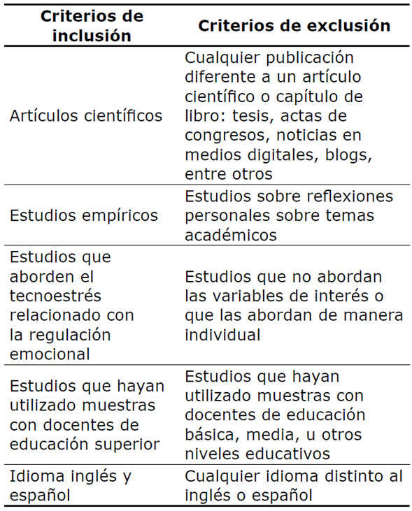 La estrategia de búsqueda incluyó los siguientes términos: (technostress*) and (“emotional regulation”, “coping emotional”, “adaptive strategies”, “emotional intelligence”, “emotional ability”) or (“university professor”, “higher education teacher”, “professor of higher education”, “university academic”).