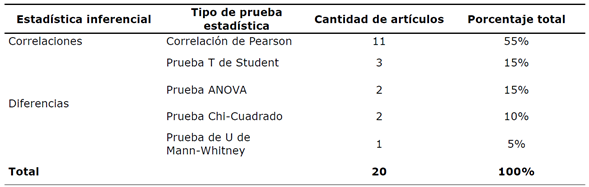 Por otra parte, la principal prueba estadística de correlación utilizada entre el tecnoestrés y la regulación es la prueba de correlación de Pearson. Mientras que para medir las principales diferencias se utilizaron con mayor frecuencia las siguientes pruebas: Anova, Chi-Cuadrado, Prueba T de Student y U de Mann-Whitney (Tabla 4).