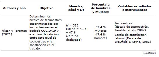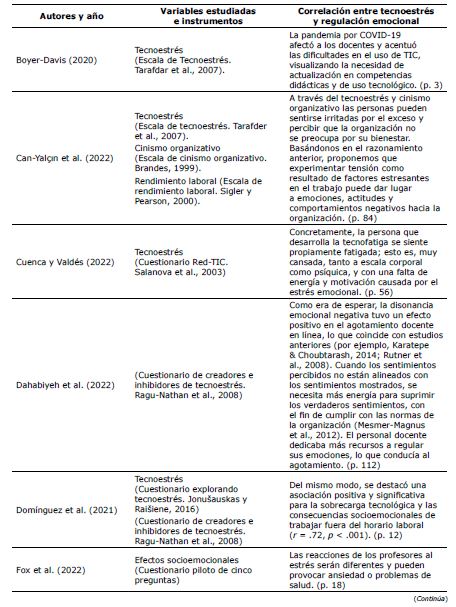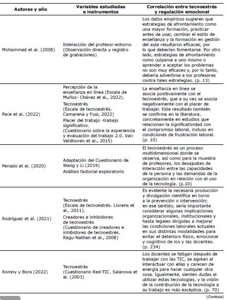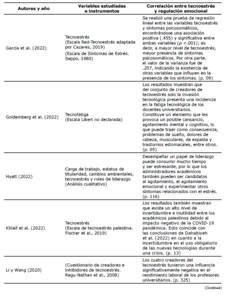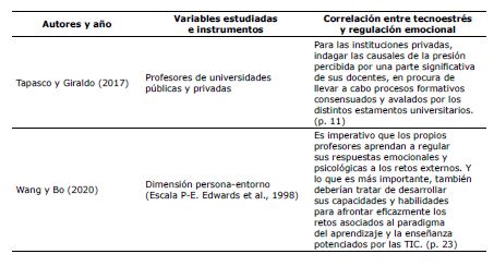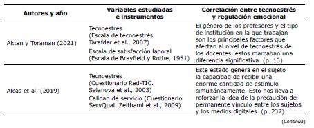 De igual modo, en la Tabla 3 se presenta las variables tecnoestrés y regulación emocional, y la correlación encontrada en la revisión sistemática.