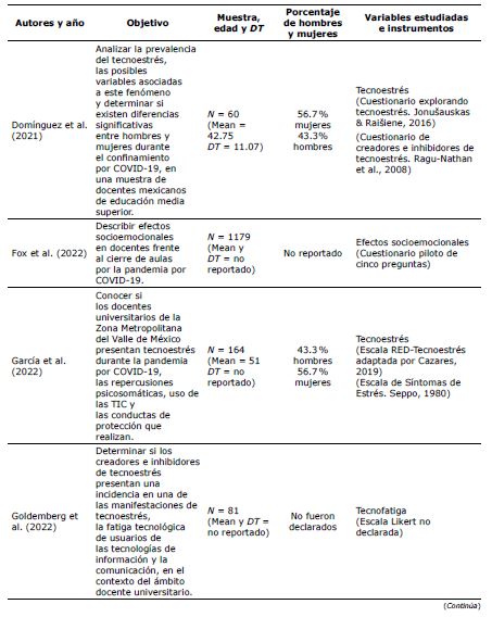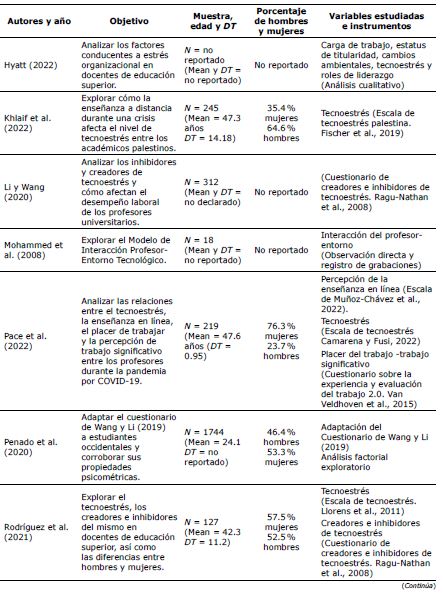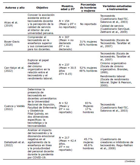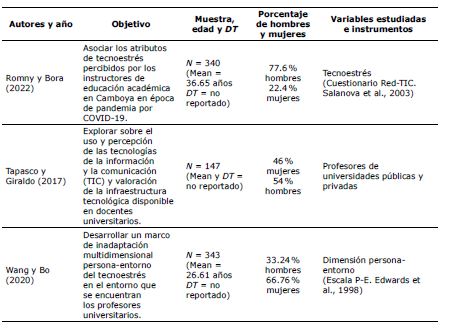 En la literatura encontrada, se observa que el 100 % de la población estudiada son docentes universitarios. Además, el 100 % de los estudios seleccionados fueron transversales, el 45 % de tipo descriptivo-correlacional y el 55 % eran de carácter exploratorio. De acuerdo con la misma revisión, en la Tabla 2 se presentan las características de los estudios encontrados.