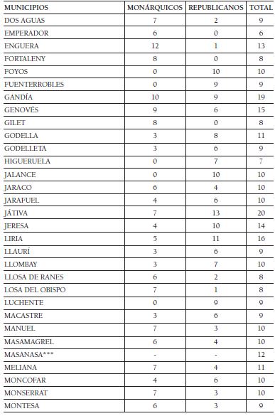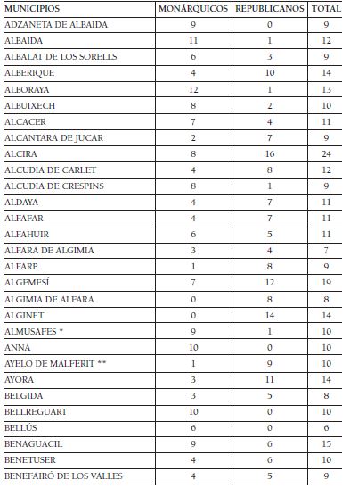 * En Almusafes, el diario El Pueblo proporciona un monárquico y seis republicanos.
