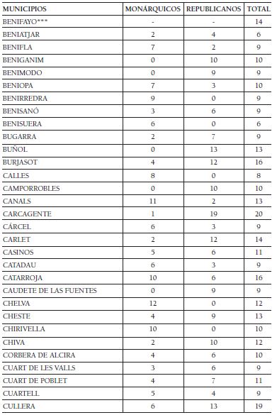 El alcance de la aplicación del artículo 29 en la provincia ha sido señala do en los trabajos de Martínez Cuadrado y de BenAmi. Según el primero, el total de candidatos de artículo 29 en la provincia fueron 503, de los que úni camente 112 fueron monárquicos, 293 republicanos y 16 socialistas, además de otros 82 indeterminados o sin datos. Cifras más precisas aporta BenAmi, quien proporciona sobre un total de 464 concejales 280 monárquicos, 154 republicanos y 26 constitucionalistas. En cuanto a los datos suministrados por la prensa, el diario católico Diario de Valencia informó el día 11 de abril que se habían proclamado el domingo anterior un total de 360 candidatos: 248 mo nárquicos y 112 republicanos. Y tres días más tarde y ya acabados los comicios, el diario republicano El Mercantil Valenciano subió la cifra a 417 (280 monár quicos y 137 republicanos)18.