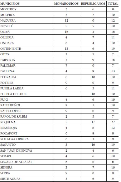 Tras expirar el plazo de presentación de solicitudes, la nueva Junta provisio nal del censo suspendió, pese a la aparente escasa gravedad de las denuncias, la friolera de 128 ayuntamientos24, es decir, prácticamente la mitad de la tota lidad de la provincia (264). Se dio además la circunstancia de que, a pesar de la igualdad electoral habida entre monárquicos y republicanos en las eleccio nes de abril, la inmensa mayoría de los comicios anulados correspondieron a localidades en las que habían triunfado los primeros. De hecho, si se analizan los cuarenta y cinco municipios suspendidos de los que se disponen datos, se verifica que únicamente en siete de ellos (Alfahuir, Alfarp, Ayora, Sumacárcel, Señera, Sedaví y San Juan de Enova), había triunfado la mayoría republicana, mientras que en los treinta y ocho restantes la victoria había sido para los mo nárquicos (ver tabla 6).
