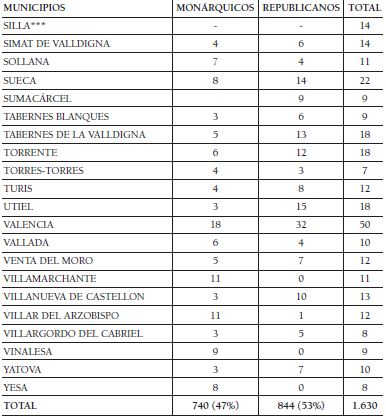 La primera conclusión que se extrae de los porcentajes de votos entre 1922 y 1931 de las localidades valencianas mayores de 6.000 habitantes, es que, tal y como se comprueba en la tabla 3, se había producido un vuelco considerable. De un porcentaje del 74 por ciento de concejales electos en 1922, los monár quicos pasaron a un exiguo 38 por ciento pocos años después. Y de manera pro porcionalmente inversa, los republicanos aumentaron del 20, al 62 por ciento del sufragio. En definitiva, se puede concluir que la Dictadura había repercuti do negativamente en el apoyo de los partidos monárquicos. Esto, en definitiva, había determinado que muchos de ellos se abstuviesen de emitir sufragio o que lo hiciesen en clave republicana, lo que motivó en última instancia que los par tidos que apoyaban a la Monarquía perdieran su antigua hegemonía.