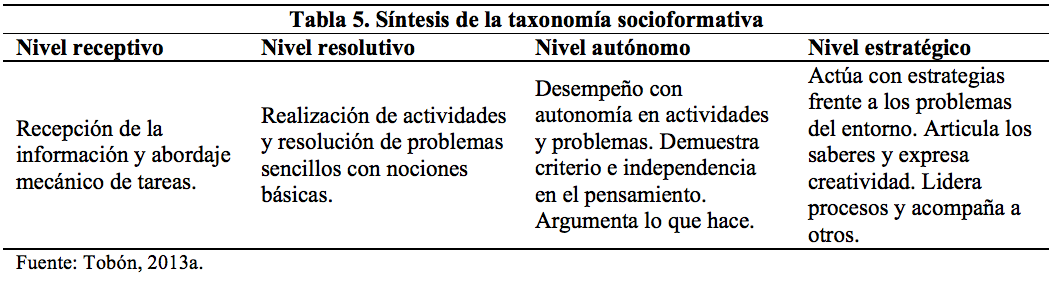 4. Evaluación y mejora. Se autoevalúan, coevalúan y heteroevalúan las evidencias con base en un instrumento para determinar el nivel de dominio obtenido, los logros y las áreas de oportunidad, y con base en ello realizar mejoras en las evidencias, hasta donde se pueda hacer. Se sugiere aplicar la taxonomía socioformativa descrita en la tabla 5 para evaluar las evidencias y el mismo portafolio, comenzando en el nivel receptivo y luego avanzar hasta llegar al nivel de dominio estratégico. La ventaja de esta taxonomía es que está articulada al nuevo modelo educativo de México, en lo referente a formar para la sociedad del conocimiento.