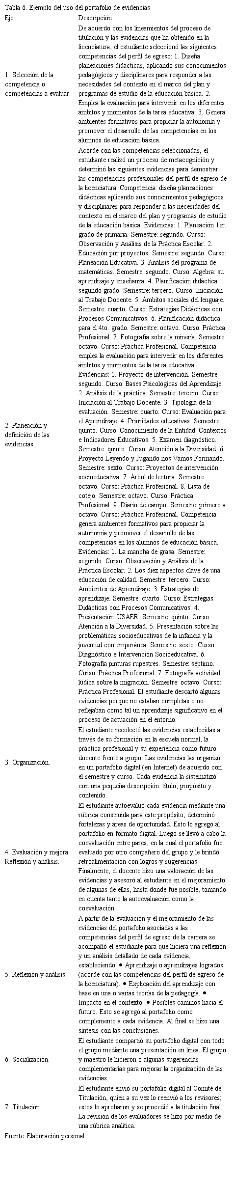 A continuación se presenta un ejemplo de aplicación del portafolio de evidencias como modalidad de titulación en la Licenciatura en Educación Primaria en la Normal de San Luis Potosí dentro de un contexto urbano. Esta modalidad es nueva y en proceso de implementación. Se trabajó con cuatro alumnos de 7o. y 8o. semestre durante un ciclo escolar. En la tabla 6 se ilustra el proceso seguido con uno de los estudiantes acorde con lo descrito en la metodología.