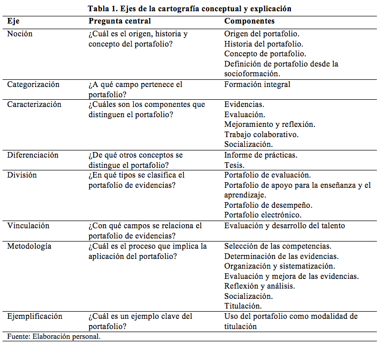 Esta investigación se realizó con el apoyo de la cartografía conceptual (Tobón, 2004 y 2015) como estrategia para gestionar el conocimiento (Ortega, Hernández y Tobón, 2015) desde el análisis teórico y conceptual-práctico. Además, sirve como estrategia académica de aprendizaje (Tobón, 2013a) y técnica de investigación. Busca la solución de problemas siguiendo procesos tales como buscar, organizar, analizar, construir y aplicar el conocimiento científico. Se basa en ocho ejes: noción, categorización, caracterización, diferenciación, división, vinculación, metodología y ejemplificación; estos son trabajados de manera secuencial (Tobón, González, Nambo y Vázquez, 2015). La cartografía conceptual permitió realizar un análisis más completo y profundo, ya que se identificaron ausencias o vacíos de información que dan pie a nuevos estudios. A continuación, en la tabla 1, se presentan los ocho ejes de la cartografía conceptual y cómo fue empleada en la realización de esta investigación.