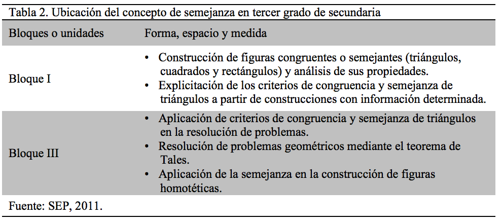 Para ello se planteó el diseño de una situación didáctica en torno al uso del tangram de siete piezas como recurso didáctico para su intervención en el tema. Hemos convenido llamar noción de semejanza, ya que el objetivo de este diseño es que el estudiante de segundo grado de secundaria desarrolle la idea del concepto de semejanza mediante un razonamiento multiplicativo. El contenido de semejanza de encuentra ubicado en el bloque I y III del plan de estudios de tercer grado (SEP, 2011), donde considera la aplicación del concepto y la construcción de figuras geométricas como se muestra en la tabla 2.