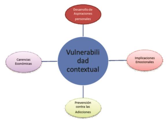 La situación de vulnerabilidad contextual delineada en esta población se hizo explícita de manera inicial por diferentes actores educativos y de instancias de gobierno municipal que acompañan a los jóvenes en su desarrollo profesional y en su vida comunitaria. Las situaciones de vulnerabilidad que identifican de forma inmediata se relacionan con las posibilidades de acceso que tienen los jóvenes a carreras de educación superior, necesidades de información sobre la sexualidad y las adicciones, así como vulnerables a los riesgos del contexto que implican el desarrollo de aspiraciones encaminadas a involucrarse en actividades del crimen organizado; las mujeres en especial se consideran vulnerables a someterse a un contexto machista que les priva de un desarrollo profesional adecuado, que a su vez las coloca en una posición de desventaja económica, cultural y social.
