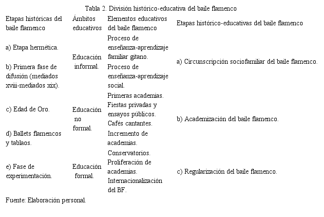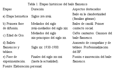 Conforme al planteamiento de Caballero (2006), se distinguen cinco etapas históricas, tal como se refleja en la tabla 1: a) etapa hermética, durante la cual se desarrolla el baile en clandestinidad por parte de las familias gitanas; b) primera fase de difusión, constituye el primer momento en el que los gitanos comienzan a tomar contacto con la población popular andaluza a través de los bailes de candil; c) Edad de Oro, cuando se instalan los cafés cantantes y se configuran los cánones que regirán el baile flamenco como lo conocemos actualmente, de ahí la importancia de los salones y los ensayos de las academias; d) ballets flamencos y tablaos, aumentan el número de compañías y de tablaos para la escenificación del baile flamenco, cuya consecuencia más inmediata será la profesionalización de los bailaores y bailaoras y, en suma, el incremento de las academias; y, e) fase de experimentación, un momento de fusión e innovación del baile flamenco en la que se consolida como especialidad en los conservatorios nacionales y se produce un proceso de internacionalización de su enseñanza debido al creciente número de alumnado extranjero, generándose una proliferación de centros privados.