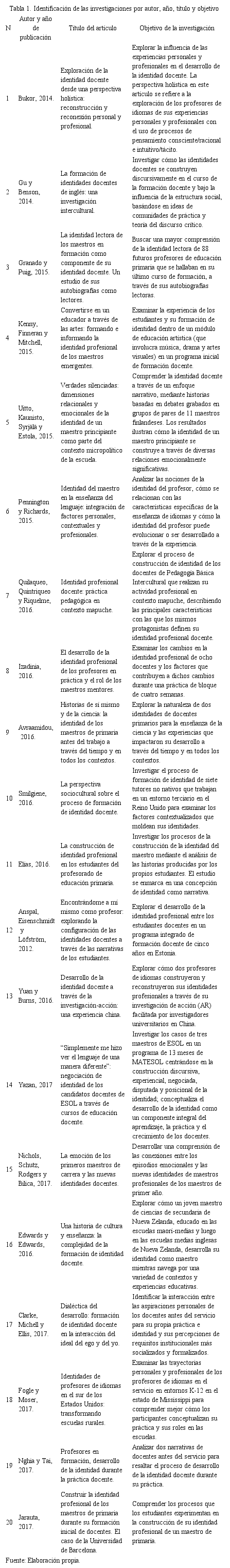 En la tabla 1 se expone la identificación de los artículos seleccionados mediante el primer apellido del autor o autores y el año de publicación, así como el título y los objetivos que perseguían los trabajos seleccionados. Un primer análisis de esta información permitió identificar que los artículos de identidad docente están trabajados a partir de narrativas de estudiantes de pedagogía de distintos niveles y de profesores en ejercicio de diversas disciplinas. El gran número de documentos son estudios de caso y narrativas a través de entrevistas semiestructuradas; algunos de ellos relacionan la práctica con la formación y las experiencias de vida a la concepción de identidad. Para los análisis se relacionan los distintos actores, como formadores de profesores, estudiantes, docentes del sistema y sus influencias en la identidad del profesor. Dentro de las conclusiones se indica que el enfoque en la formación del profesorado no se centra en la identidad del maestro, por lo que existen vacíos en la formación respecto de una reflexión necesaria para comprender el impacto que posee en la profesión docente.