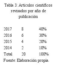 Fuente: Elaboración propia.La tabla 3 representa la cantidad de artículos científicos revisados por año de publicación. Se puede observar que la temática ha sido constantemente abordada, “los últimos veinte años se ha desarrollado una línea de investigación sobre la identidad profesional de los docentes; sin embargo las temáticas, los enfoques y los propósitos de los investigadores son variados” (Elías, 2016, p. 337); por lo tanto, “la identidad profesional es un tema que ha traído el interés de muchos investigadores por décadas” (Nghia y Tai, 2017, p. 1), yaciendo una temática interesante de estudiar por su multiplicidad de aristas desde las cuales se puede profundizar.