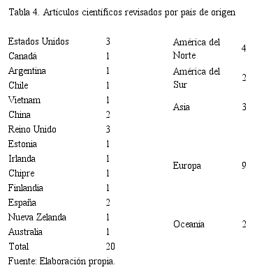 Fuente: Elaboración propia.En la tabla 4 se evidencia el número total de artículos según el país donde se realizó la investigación y el continente de procedencia. En primer lugar, se observa que el mayor número de publicaciones (9) proviene de diferentes países de Europa; se destaca la producción de investigaciones provenientes de Reino Unido (3) y España (2); le sigue América del Norte (4), con publicaciones de Estados Unidos (3) y Canadá (1) y finalmente el continente de Asia (3) con experiencias desde China (2) y Vietnam (1); también se presentan publicaciones desde América del sur (2) y Oceanía (2).