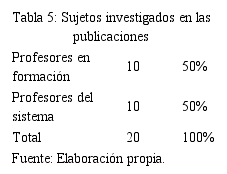 La tabla 5 expone el número total de participantes de las investigaciones analizadas con su respectiva distinción entre los profesores en formación y los profesores del sistema escolar.