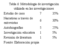 En segundo lugar se encuentran las narrativas a través de entrevistas semiestructuradas (6), representando un 30% del total. Demuestra que un gran número de investigadores escoge esta técnica para conocer en profundidad las identidades de los docentes; por lo tanto, las narrativas “son continuamente construidas, reflejan los contextos sociales en los que se crean e involucran ideologías dentro de los entornos sociales del individuo” (Taylor y Littleton, 2006). Por otra parte, el 25% de las investigaciones se presenta a través de autobiografías (5); “a través de estas historias, los investigadores han intentado capturar toda la identidad. Consideramos la identidad del maestro como una historia compuesta de varias historias pequeñas” (Uitto et al., 2015, p. 165).