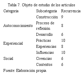 El resultado de lo que se ha investigado en las publicaciones a partir de un análisis documental responde a la pregunta: ¿cómo se aborda la identidad docente en los artículos revisados? Para identificar el objeto de investigación se utilizó el análisis de contenido, método de investigación en el que Según Hernández Sampieri (2006, p. 357) “se efectúa por medio de la codificación, es decir, el proceso en virtud del cual las características relevantes del contenido de un mensaje se transforman a unidades que permiten su descripción y análisis preciso”, categorías y subcategorías que se descubrieron a partir del análisis de los artículos.