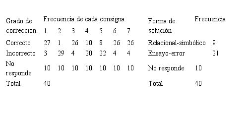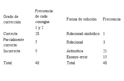 El análisis de los resultados fue organizado a partir de dos elementos: el grado de corrección y las formas de solución manifestadas por los maestros al momento de dar respuesta a las tareas matemáticas. Es en las formas de solución en las que se refiere y caracteriza la actividad matemática realizada por los futuros docentes y en las que se identifica si emerge o no el carácter relacional y significados de las literales.