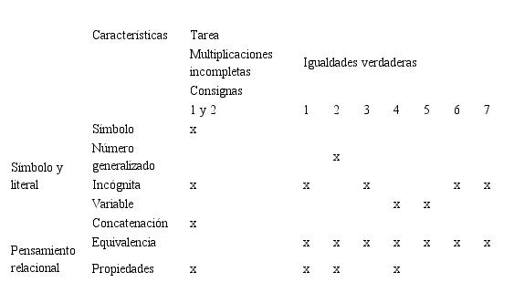 Particularmente, en este estudio es de interés abordar las nociones de equivalencia y propiedades de las operaciones enmarcadas en el pensamiento relacional. Respecto al significado de las literales, referimos al número generalizado, incógnita, variable y concatenación. A partir de estos elementos se seleccionaron dos tareas que se describen posteriormente.