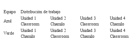 En la primera etapa del estudio se probaron los SGA Classroom y Chamilo por medio de la carga, en ambas plataformas, de los materiales de una materia de cuatro unidades y dividiendo al grupo de investigación en dos equipos: verde y azul. Estos equipos fueron trabajando de forma alternada en ambas plataformas y con cada unidad de la materia; es decir, cada equipo trabajó dos unidades en cada plataforma estudiada. La tabla 2 muestra el orden en el que los equipos fueron usando cada una de las plataformas.