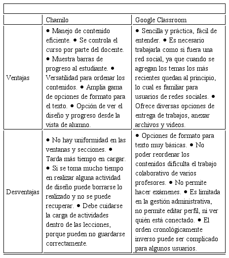 Cuando ambos equipos terminaron de trabajar con los SGA, se realizó una mesa de discusión correspondiente a la segunda etapa de investigación. En dicha mesa se compartieron experiencias y se debatieron diversos aspectos acerca del uso de las plataformas, tras lo cual se llegó a un consenso con respecto a las ventajas y desventajas de cada una, resumidas en la tabla 3.
