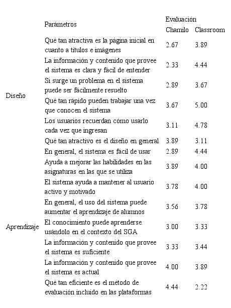 La tabla 4 presenta los 14 parámetros utilizados para evaluar las plataformas en la tercera y última etapa de la presente investigación, los cuales fueron derivados de la literatura consultada, del análisis de los resultados anteriores y se dividieron en dos tipos: diseño y aprendizaje. Este instrumento permite medir el nivel de satisfacción del docente en cuanto a cada uno de los parámetros. En la tabla 4 se presenta cada parámetro y la media aritmética de la puntuación otorgada por los investigadores a cada SGA (n=9).