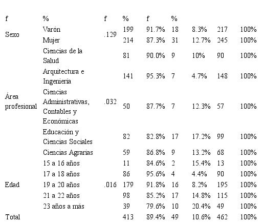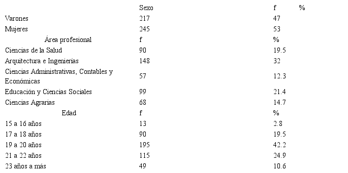 La muestra estuvo conformada por 462 estudiantes de pregrado de la Universidad Nacional del Centro del Perú. El 47% eran varones y 53% mujeres. La selección de los participantes se realizó a través de muestreo aleatorio estratificado. La muestra fue representativa con un nivel de confianza del 95% y un margen de error del 5%; el tamaño de la muestra señala que debía aplicarse el instrumento a 373 estudiantes universitarios como mínimo. En la tabla 1 se consideran las características de la muestra.