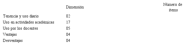 El instrumento para recoger los datos fue denominado “Cuestionario sobre uso del smartphone”, construido ad hoc previa revisión bibliográfica (Cruz y Barragán, 2017; López, 2016; Salcines y González, 2016; Vázquez y Sevillano, 2015). La determinación de la validez del instrumento se realizó a través del coeficiente de validez de contenido (CVC) propuesto por Hernández-Nieto (2011), obteniéndose 0.918, lo que permite sostener que el instrumento presenta validez y concordancia excelente. Respecto a la fiabilidad, la puntuación del Alfa de Cronbach del instrumento es de 0.892, lo que indica que el instrumento es confiable para el estudio. El cuestionario contiene preguntas relacionadas a las características sociodemográficas (sexo, área profesional y edad) y al uso del smartphone, agrupadas en cinco dimensiones con un total de 32 ítems, como se evidencia en la tabla 2.