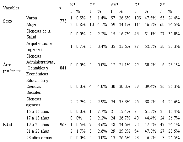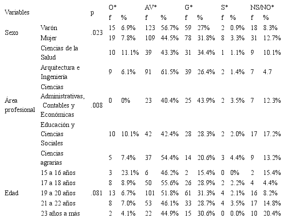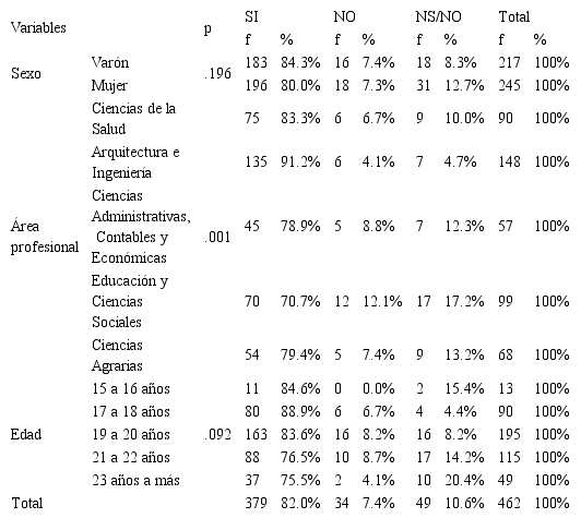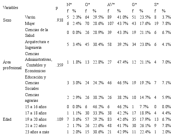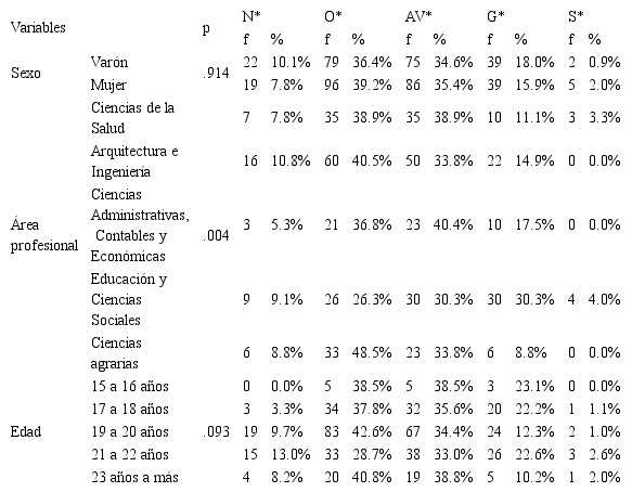 En cuanto al análisis de datos, las variables cualitativas se presentan según su distribución de frecuencias y porcentajes. Se han realizado los análisis no paramétricos después de comprobar el incumplimiento de los supuestos de normalidad, para analizar las diferencias de la variable “sexo” se llevó a cabo la prueba U de Mann-Whitney y para las variables “área profesional” y “edad” se utilizó la prueba Kruskal-Wallis porque presentan más de dos valores de respuesta. Las diferencias son consideradas significativas a partir de p < .05 (Giménez, Maquilón y Arnaiz, 2015; González, Escoto y Chávez, 2017; Supo, 2014).
